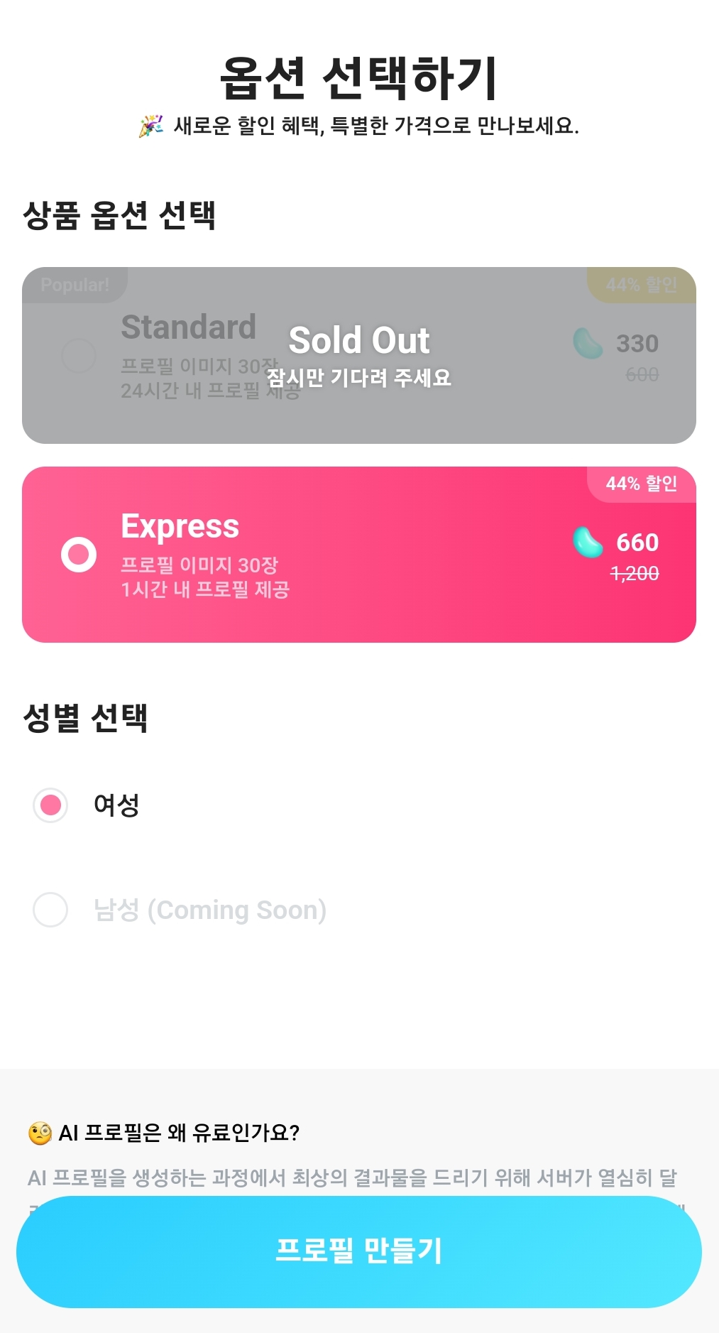옵션과 성별까지 모두 선택하면 결제창이 뜨게 되는데요,